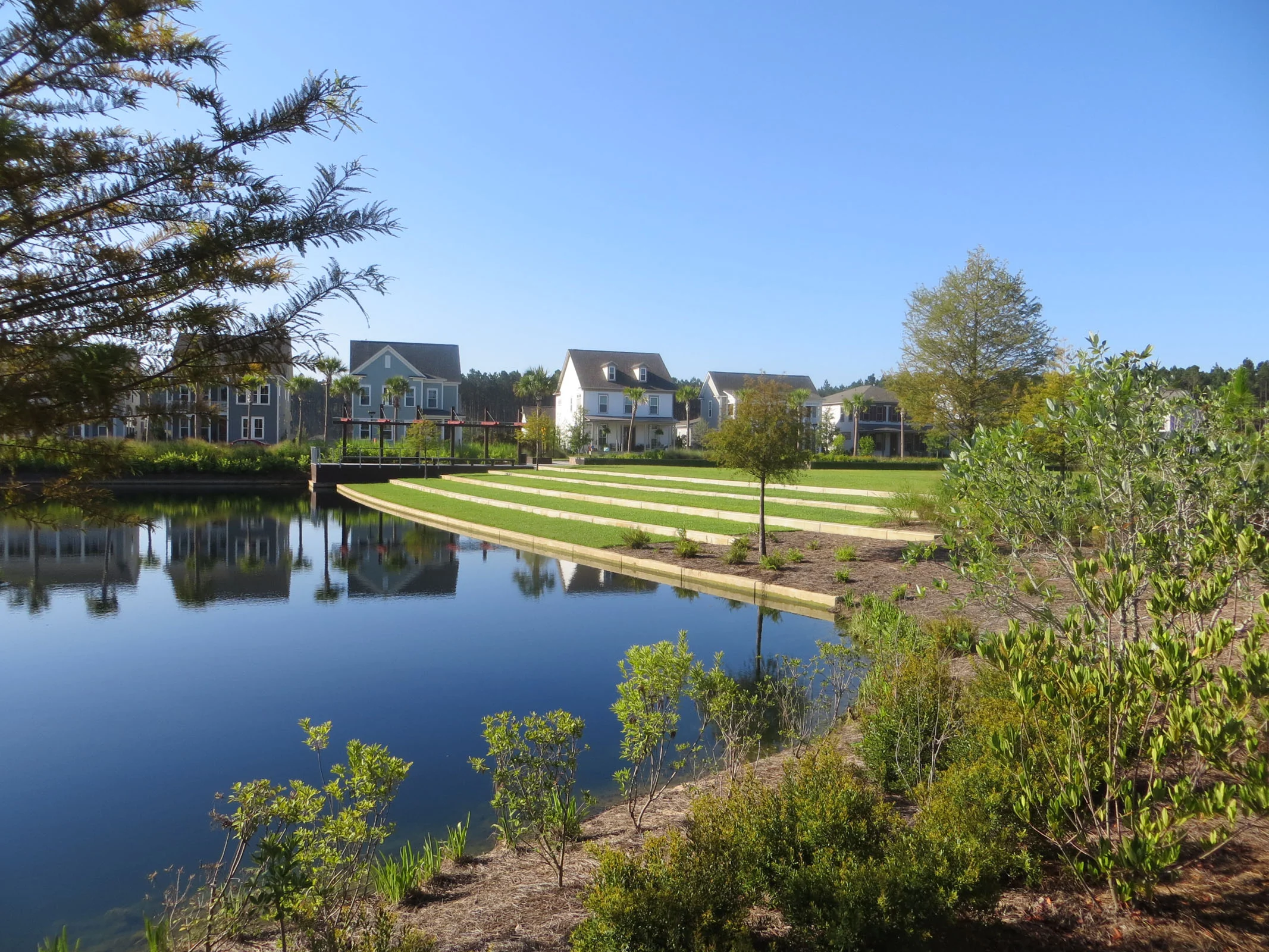 Rendering visible this critical relationship between water and planting grounded the New Town to timeless regional patterns. The development of a unique modern language for site structures and forms- postal pavilions, overlooks, pocket parks, and pathways was intended to create a unique identity for the public realm. Nexton Brighton Park provides a linked series if iconic spaces for the community that are highly integrated with the surrounding neighborhood as well as with the natural flows and ecological patterns of the site. The park’s xeric, mesic, and hydric zones correspond to unique programming and distinctive plant communities. The park’s forms mediate between the traditional architecture of the neighborhoods and the surrounding Carolina low country.