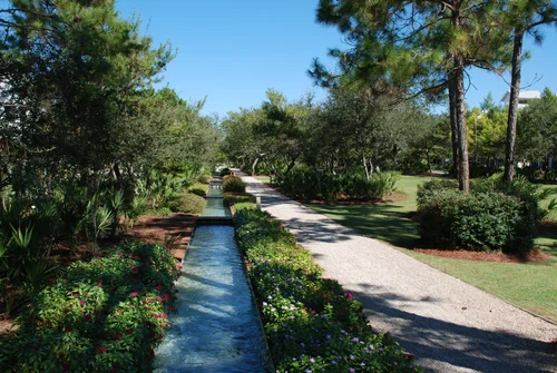 Local and regional cultural influences informed the design of all public spaces. At Cerulean Park, WaterColor’s central public space, a 340-foot long, four foot wide canal celebrates the importance of water in this region, passing remnants of the original forest preserved throughout the green. The canal recalls irrigation ditches and channels of the Florida agricultural landscape and tannic-black water creeks that flow into the nearby lake. At the canal’s end, an oval basin recalls the limestone sinkholes found throughout the region.